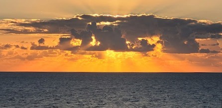 However, with as I drift, the moon has come out and shown some light on the choppy waters. The raft moves as I balance on it, trying to avoid falling into the water. With time, the sun rises and reveals calmer waters with a burgeoning horizon.