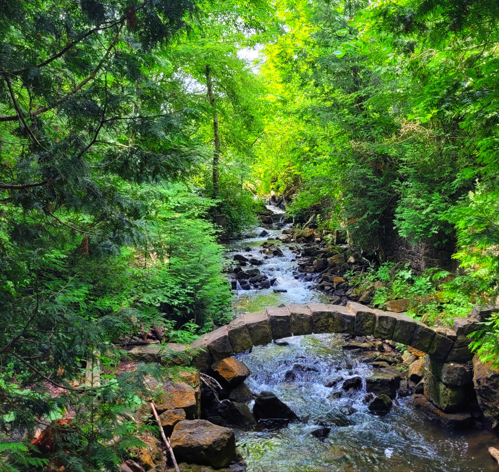Shrouded by a mature forest with well-maintained trails, we wandered along the marked paths to see some unique historical spots. The trails brought us to two stone structures. Both were used for industrial purposes, but felt old-worldly and organic. After that, we continued on the trail across a small creek with an old stone arch. We ventured into the reserve order of the markers to get to a small series of caverns with ladders to move you from the upper to the lower trail. With Agatha, we had to reverse course and take the flatter trails.